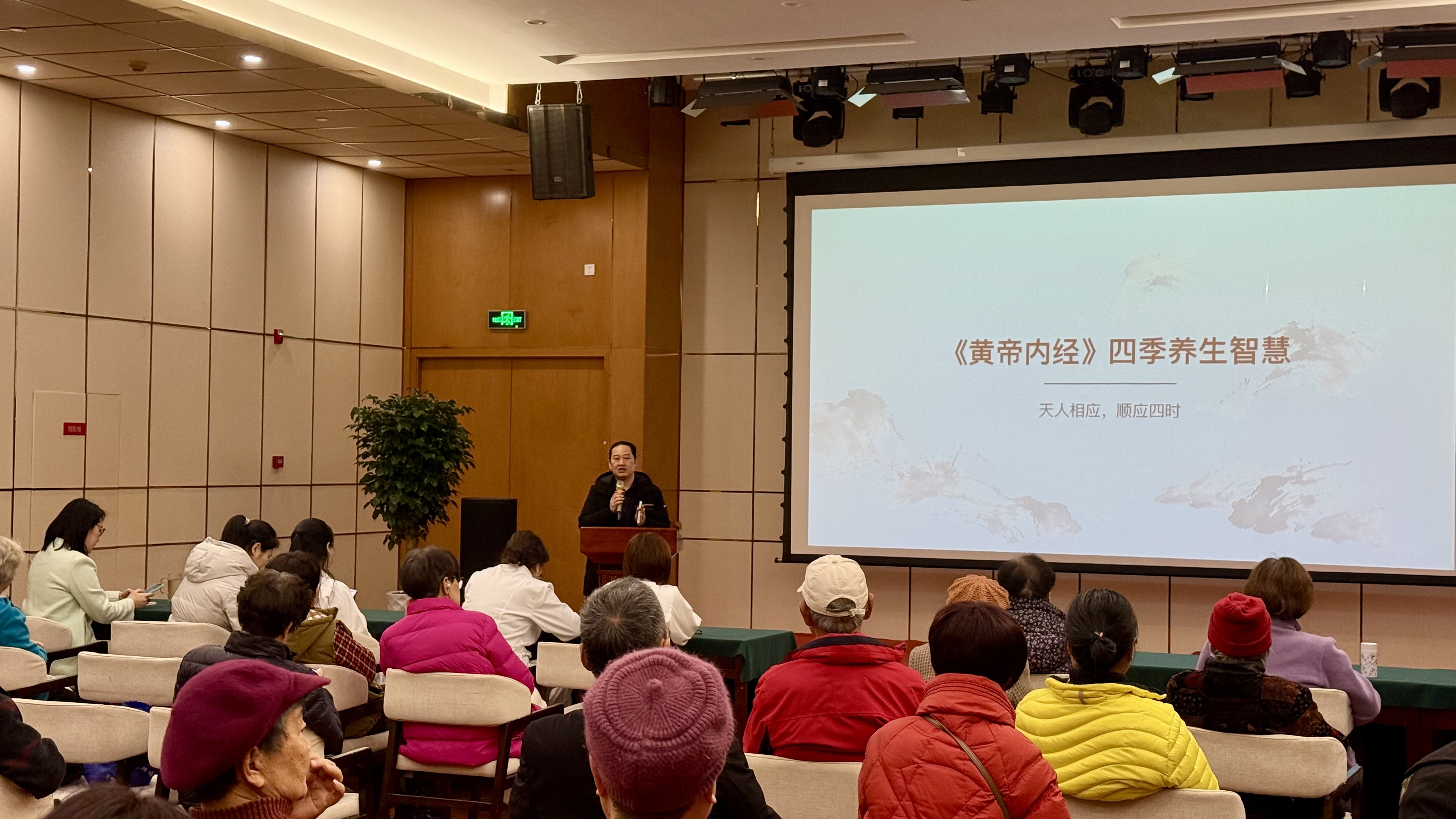 讲座现场,柔和的灯光与舒适的座椅让长辈们得以静心听讲。徐医师将复杂的中医理论转化为通俗易懂的生活建议,把“顺时养生”的理念融入日常细节,让大家听得懂、学得会、用得上。