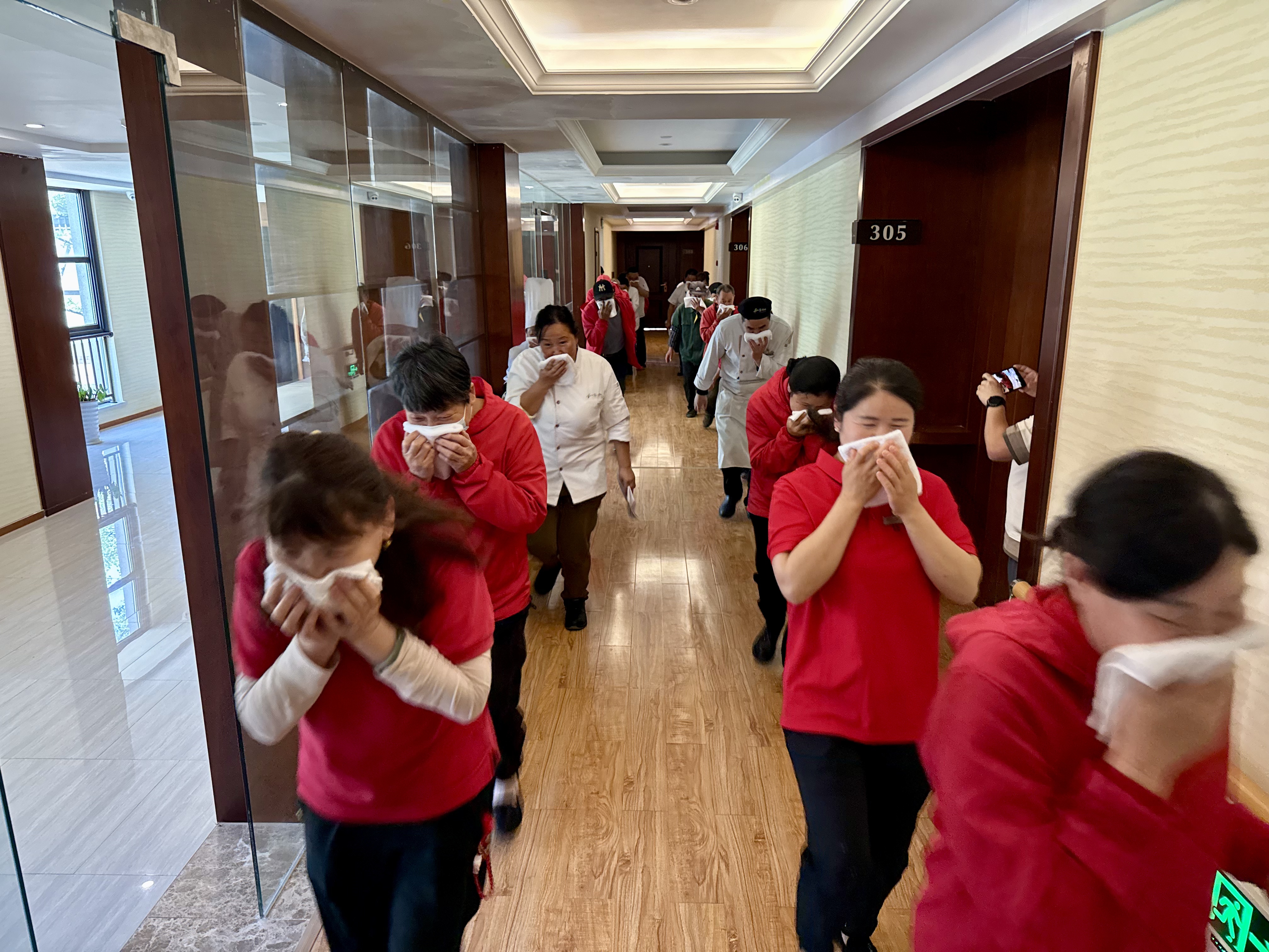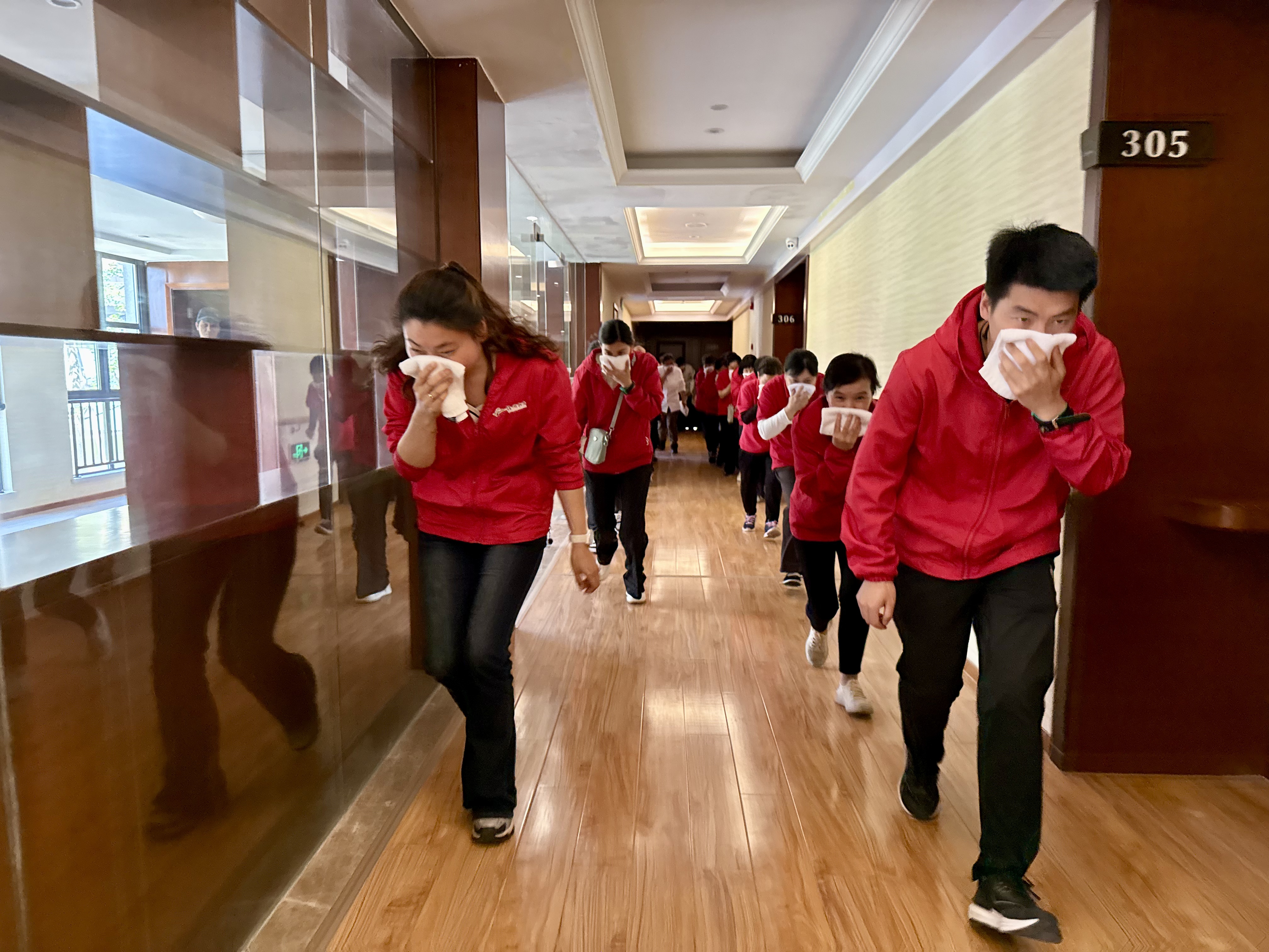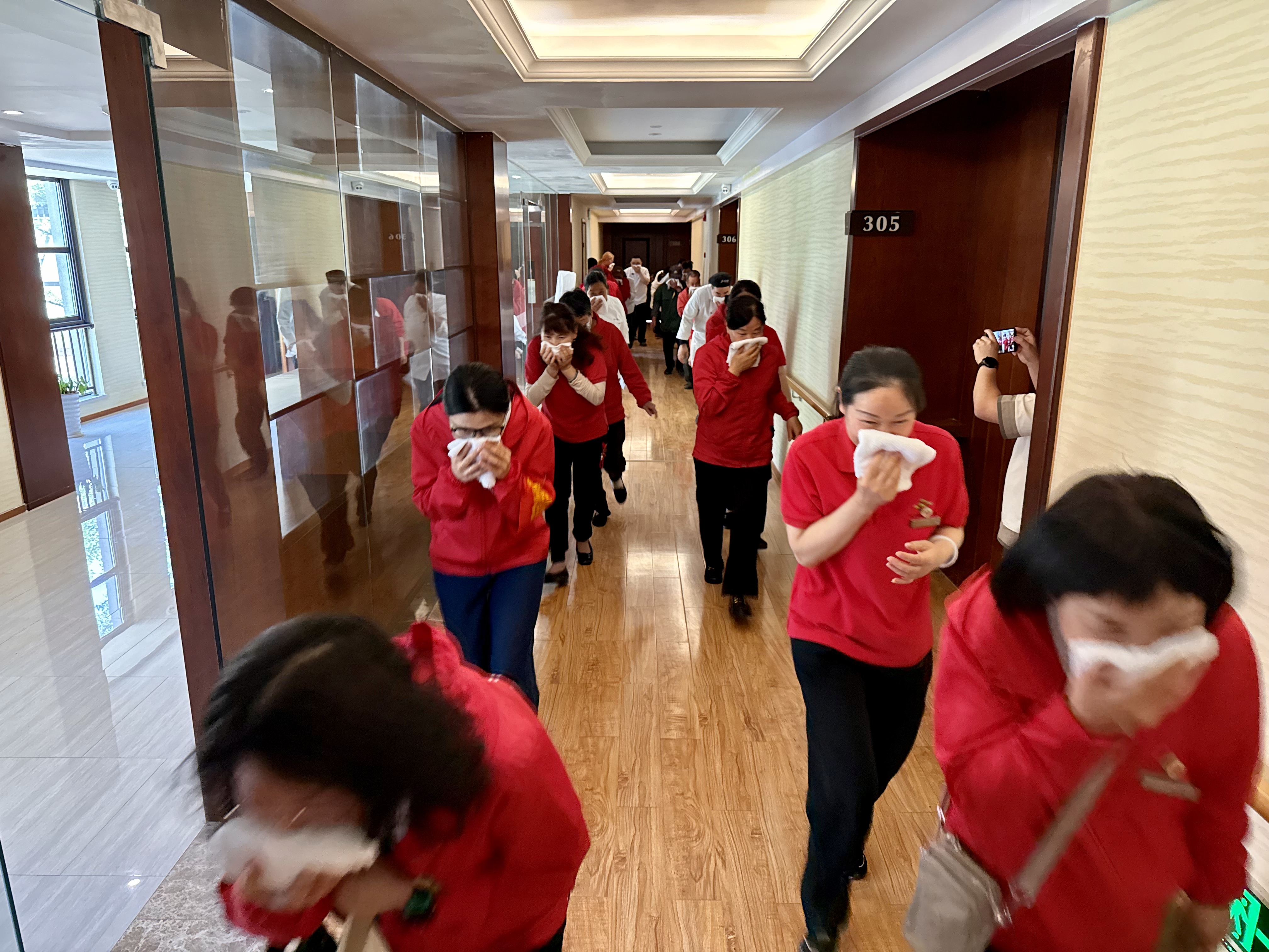 人员疏散组紧急疏散火灾所在楼栋的其他人员有序逃生。在各个楼层的安全出口位置引导组织所有人员疏散,并查看有无落单人员。大家手握毛巾捂紧口鼻,弯腰有序逃生。