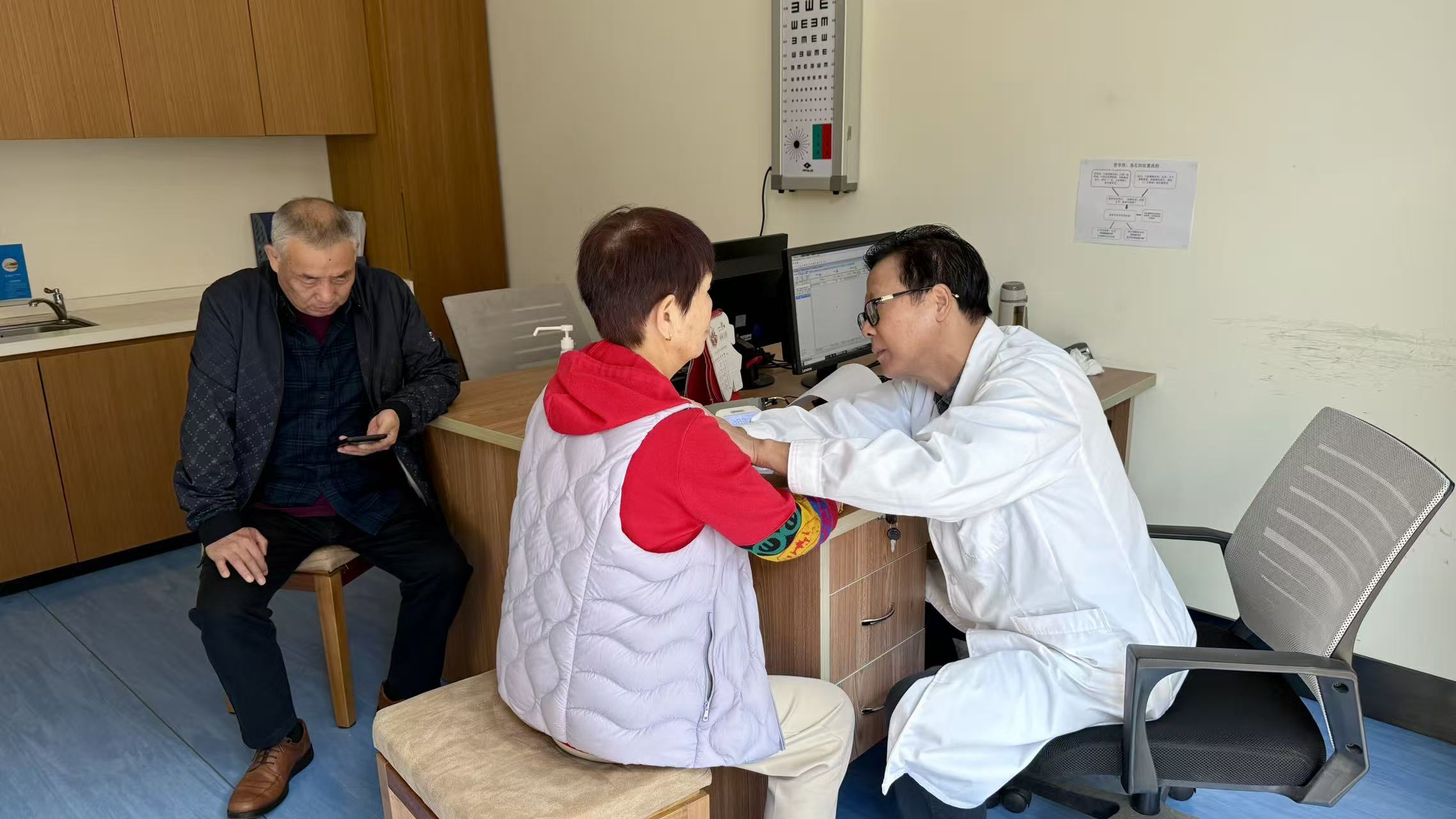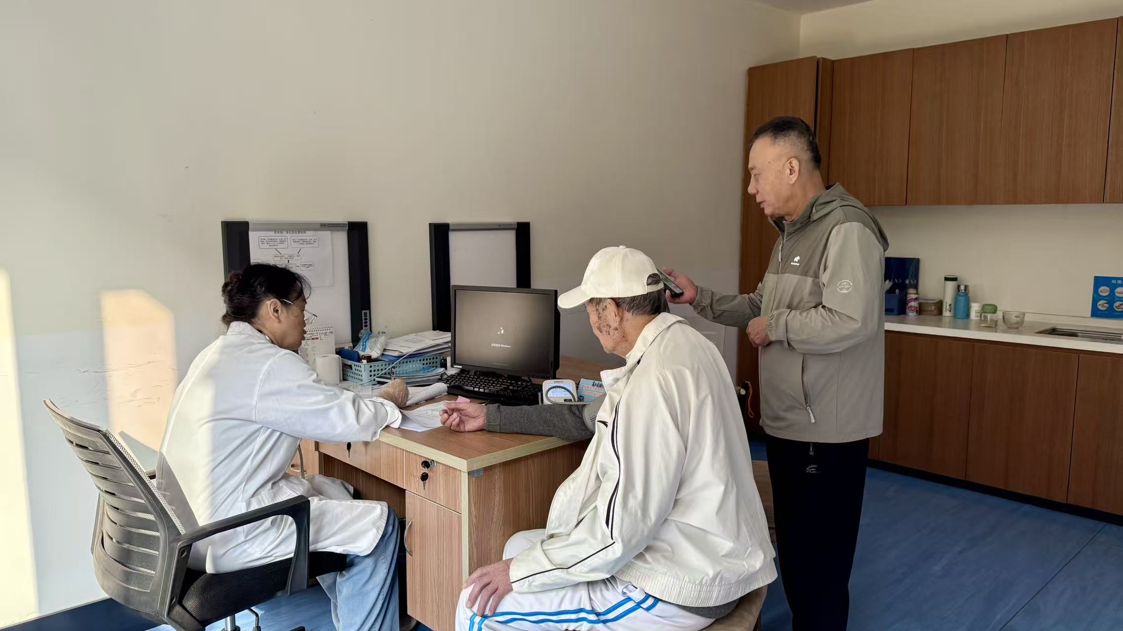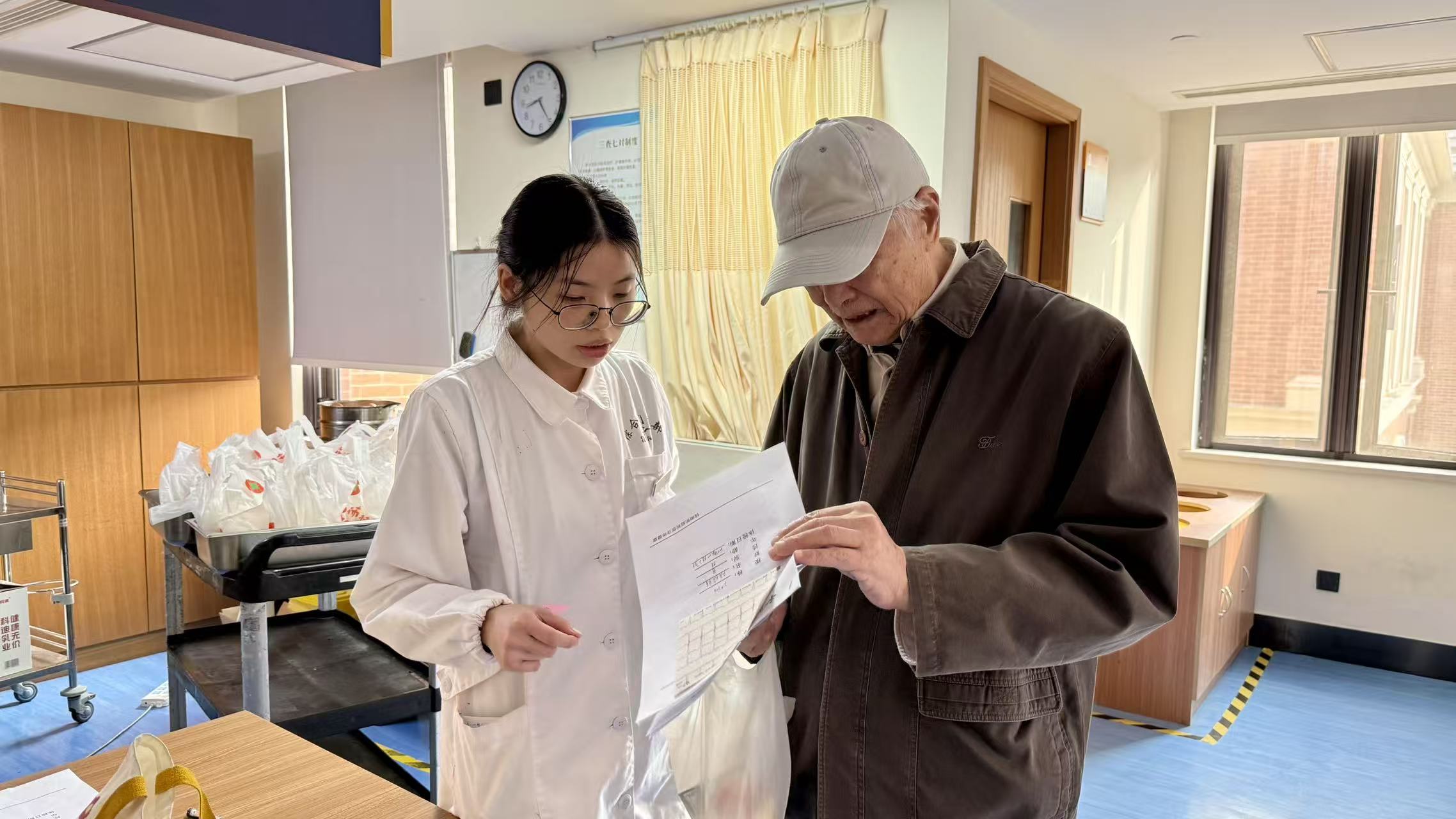体检过程中,医护人员始终保持着耐心与严谨:为行动不便的叔叔阿姨搀扶引路,为视力不佳的长辈细致解读体检表,对大家关心的健康问题逐一解答,用专业的态度消除每一位长辈的顾虑。工作人员也全程陪伴在侧,时而协助整理体检资料,时而递上一杯温热的开水,一句句“您慢慢来”“有需要随时叫我”,让整个体检现场充满了暖意。